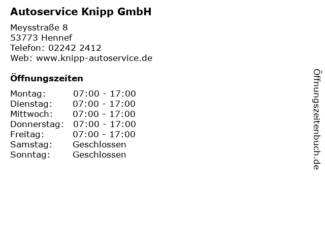 | Öffnungszeiten Autoservice Knipp GmbH in Hennef anzeigen | |
