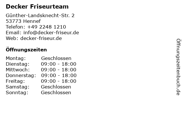 | Öffnungszeiten Decker Friseurteam in Hennef anzeigen | |
