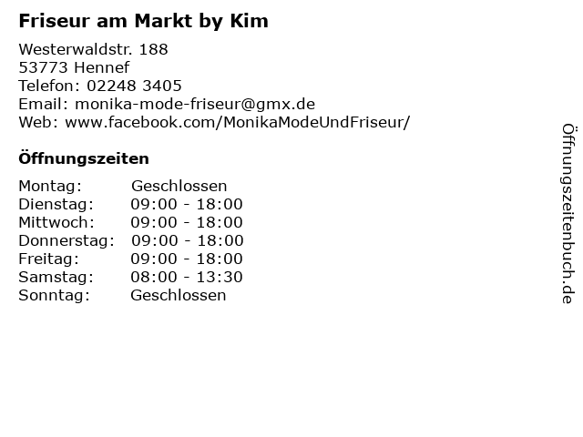 | Öffnungszeiten Friseur am Markt by Kim in Hennef anzeigen | |