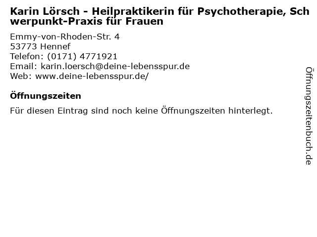 | Karin Lörsch - Heilpraktikerin für Psychotherapie, Schwerpunkt-Praxis für Frauen anrufen | |