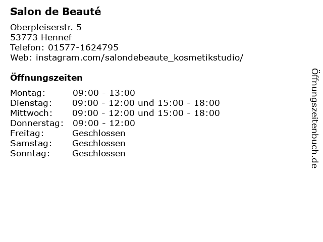 | Öffnungszeiten Salon de Beauté in Hennef anzeigen | |