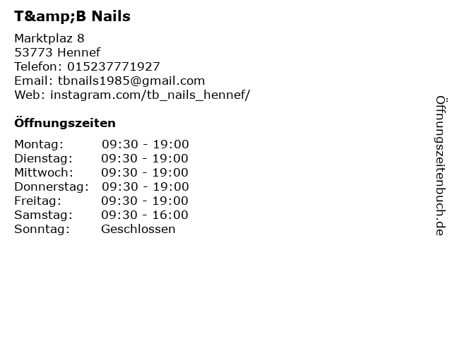 | Öffnungszeiten T&B Nails in Hennef anzeigen | |