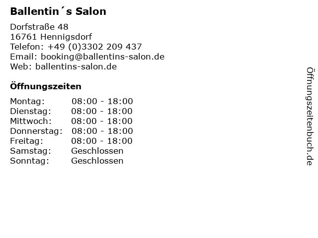 | Öffnungszeiten Ballentin´s Salon in Hennigsdorf anzeigen | |