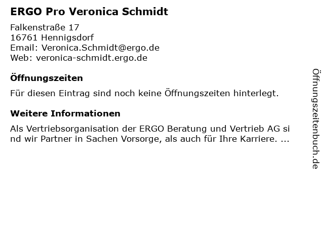 | Öffnungszeiten ERGO Pro Veronica Schmidt in Hennigsdorf anzeigen | |