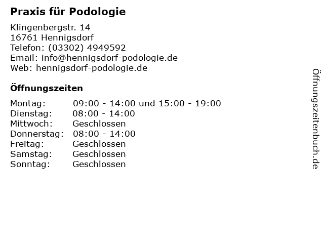 | Telefonnummer Praxis für Podologie in Hennigsdorf ((03302) 4949592) anrufen | |
