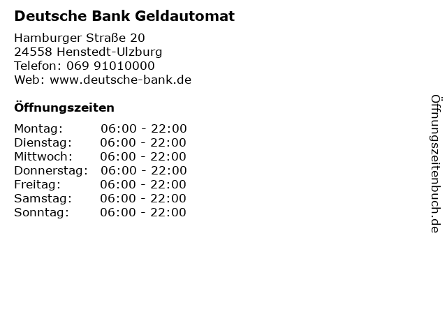 3 Deutsche Bank Finanzagentur Henstedt-Ulzburg (Entfernung: 0,01 km) Hamburger Straße 20, 24558 Henstedt-Ulzburg 4 Sparkasse Südholstein (Geldautomat) (Entfernung: 0,09 km) Hamburger Straße 83, 24558 Henstedt-Ulzburg 5 VR Bank in Holstein eG - Geschäftsstelle (Entfernung: 0,17 km) Hamburger Straße 28, 24558 Henstedt-Ulzburg 6 Raiffeisenbank eG Bad Bramstedt • Henstedt-Ülzburg - (Geldautomat) (Entfernung: 0,19 km) Hamburger Str. 8, 24558 Henstedt |