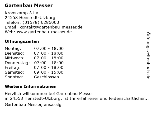 | Öffnungszeiten Gartenbau Messer in Henstedt-Ulzburg anzeigen | |