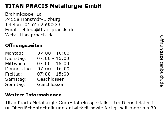 1 TITAN Präcis Metallurgie GmbH Oberflächenmetallurgie (Entfernung: 0,04 km) Brahmkoppel 1a, 24558 Henstedt-Ulzburg 6 |