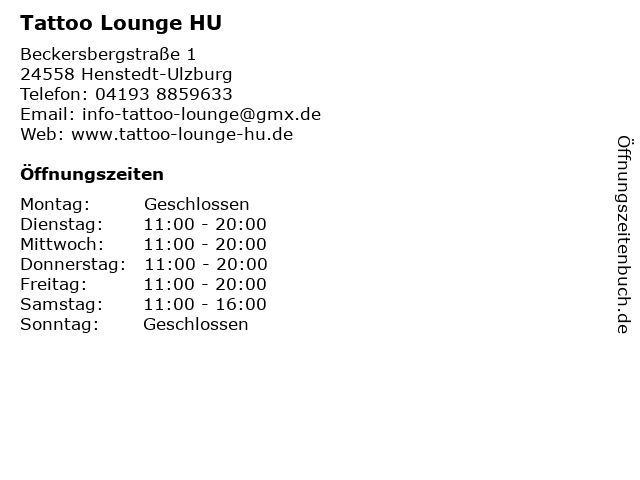 | Öffnungszeiten Tattoo Lounge HU in Henstedt-Ulzburg anzeigen | |