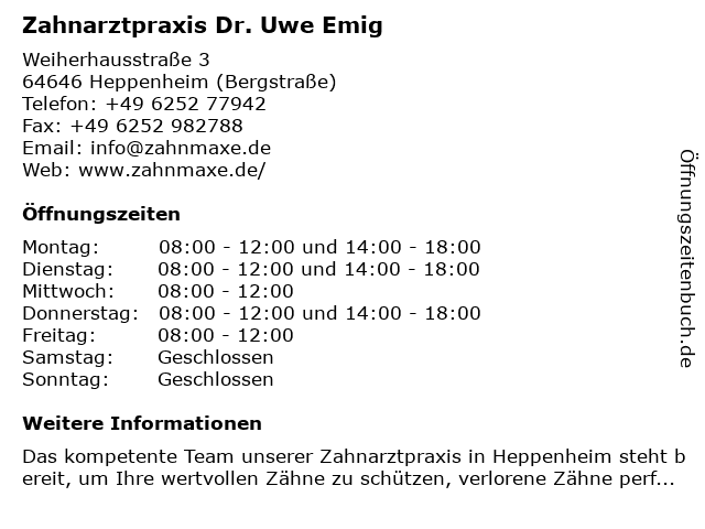 1 3 Dr.med.dent. Stephan Peylo und Dr.med.dent. Annette Peylo Gemeinschaftspraxis für Kieferorthopädie (Entfernung: 0,71 km) Friedrichstraße 36, 64646 Heppenheim 4 Dr. med. dent. Anja Menzel - Zahnärztin Heppenheim (Entfernung: 0,76 km) Friedrichstraße 28, 64646 Heppenheim (Bergstraße) 6 Zentrum für Zahnheilkunde Dr. med. dent. Johannes Schmitt (Entfernung: 4,35 km) Nibelungenstraße 16A, 64625 Bensheim |