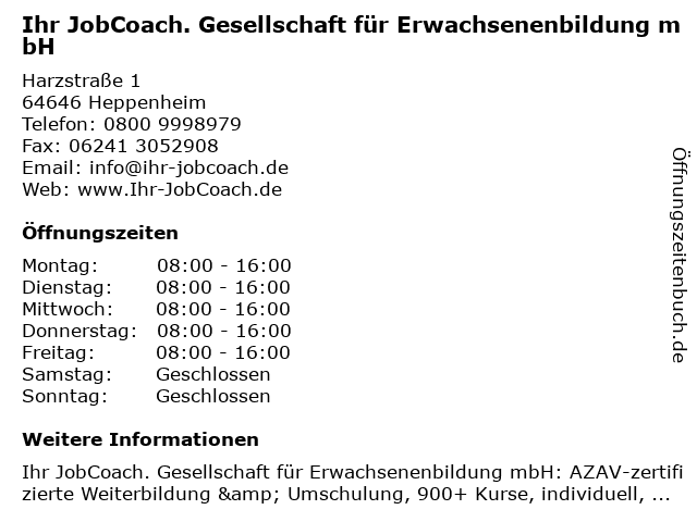 1 Ihr JobCoach. Gesellschaft für Erwachsenenbildung mbH (Entfernung: 11,33 km) Industriestraße 11, 68642 Bürstadt 2 Ihr JobCoach. Gesellschaft für Erwachsenenbildung mbH (Entfernung: 14,45 km) Freiheitsstraße 15, 68623 Lampertheim 6 |