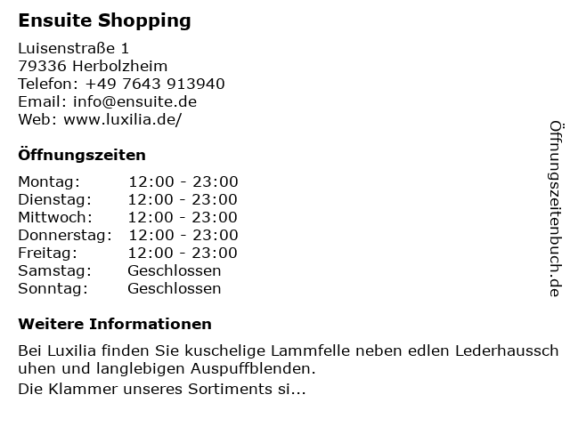 | Öffnungszeiten Ensuite Shopping in Herbolzheim anzeigen | |