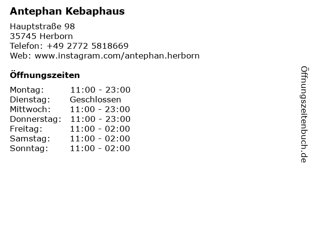 | Öffnungszeiten Antephan Kebaphaus in Herborn anzeigen | |