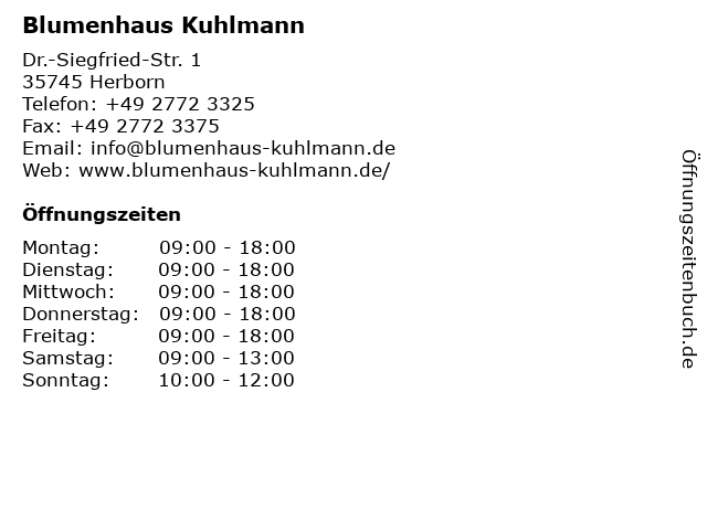 | Öffnungszeiten Blumenhaus Kuhlmann in Herborn anzeigen | |