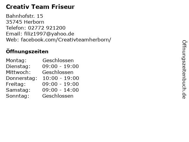 | Öffnungszeiten Creativ Team Friseur in Herborn anzeigen | |