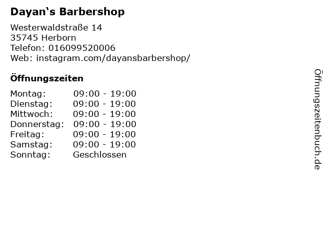 | Telefonnummer Dayan‘s Barbershop in Herborn (016099520006) anrufen | |