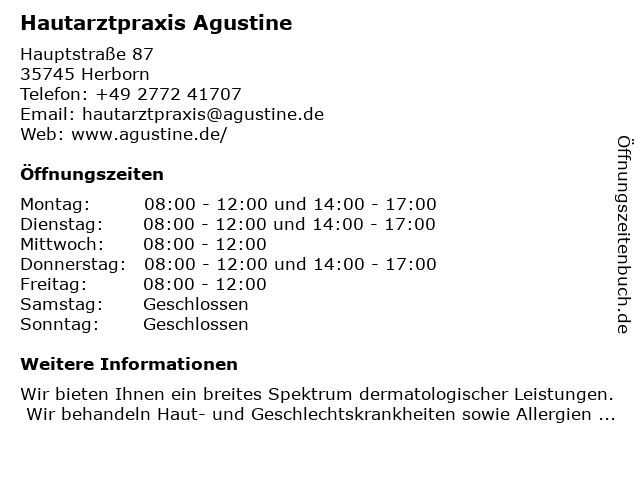 | Öffnungszeiten Hautarztpraxis Agustine in Herborn anzeigen | |
