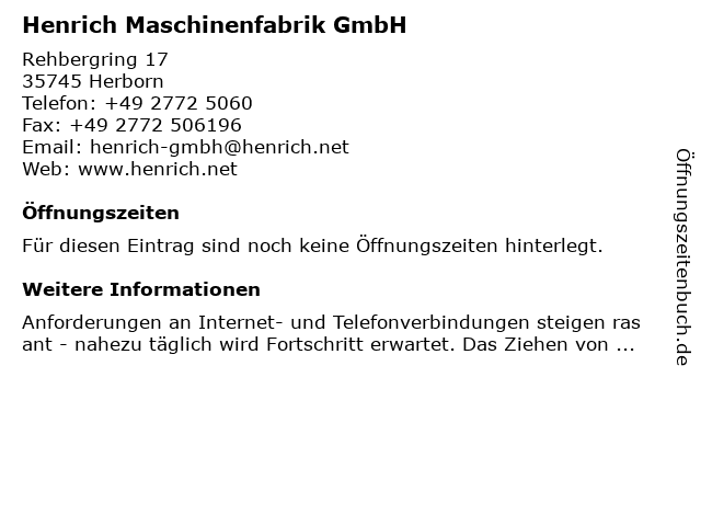 | Öffnungszeiten Henrich Maschinenfabrik GmbH in Herborn anzeigen | |