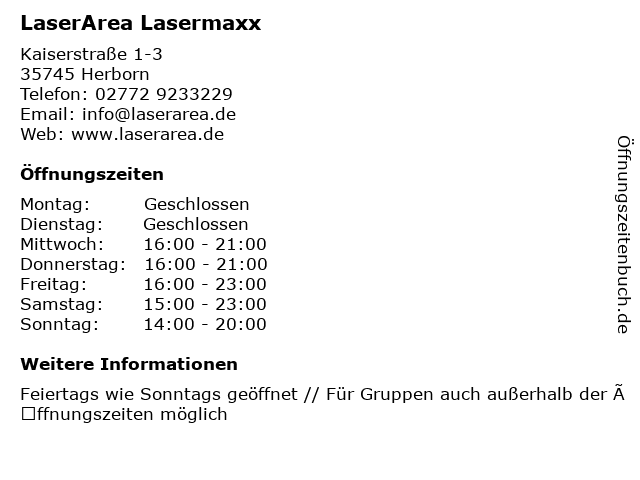 | Öffnungszeiten LaserArea Lasermaxx in Herborn anzeigen | |