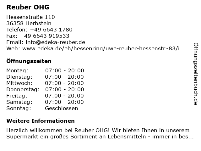 | Öffnungszeiten Reuber OHG in Herbstein anzeigen | |