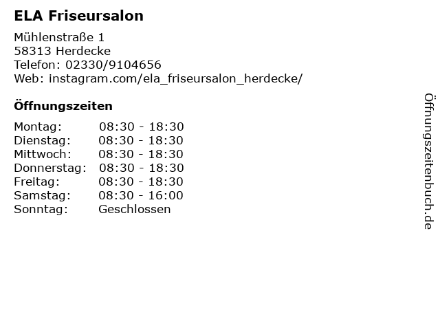 | Öffnungszeiten ELA Friseursalon in Herdecke anzeigen | |