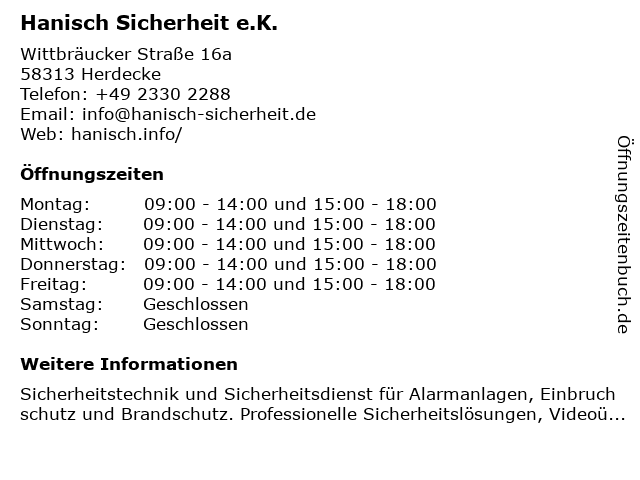 | Öffnungszeiten Hanisch Sicherheit e.K. in Herdecke anzeigen | |