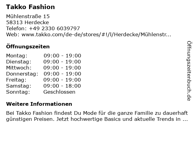 | Öffnungszeiten Takko Fashion in Herdecke anzeigen | |