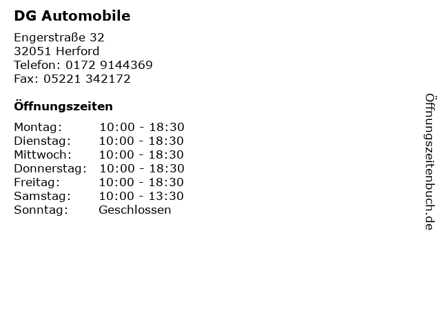 | Öffnungszeiten DG Automobile in Herford anzeigen | |