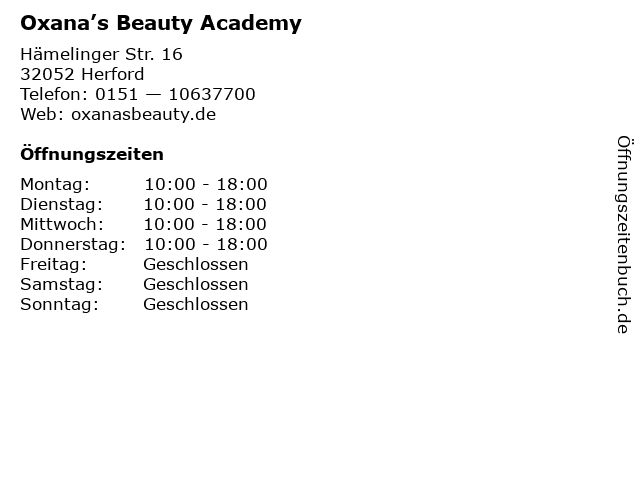 | Öffnungszeiten Oxana’s Beauty Academy in Herford anzeigen | |