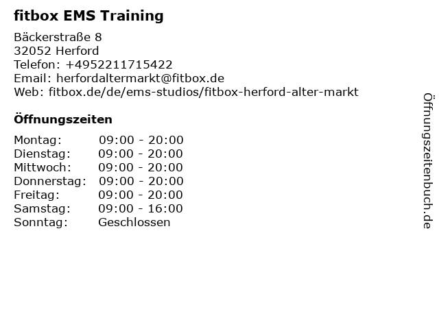 | Öffnungszeiten fitbox EMS Training in Herford anzeigen | |