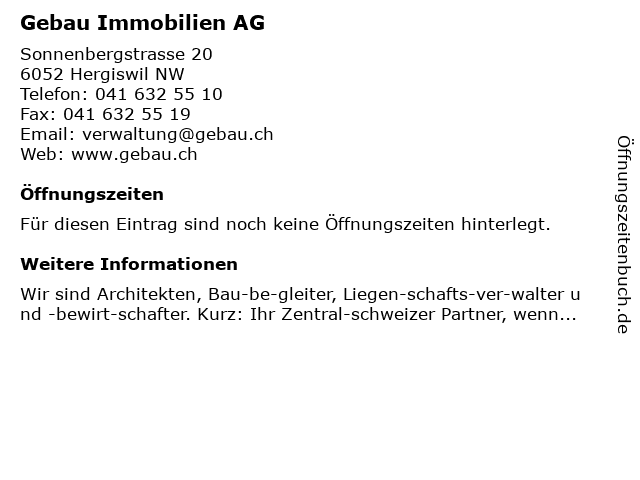 | Öffnungszeiten Gebau Immobilien AG in Hergiswil NW anzeigen | |