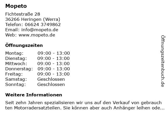 | Öffnungszeiten Mopeto in Heringen (Werra) anzeigen | |