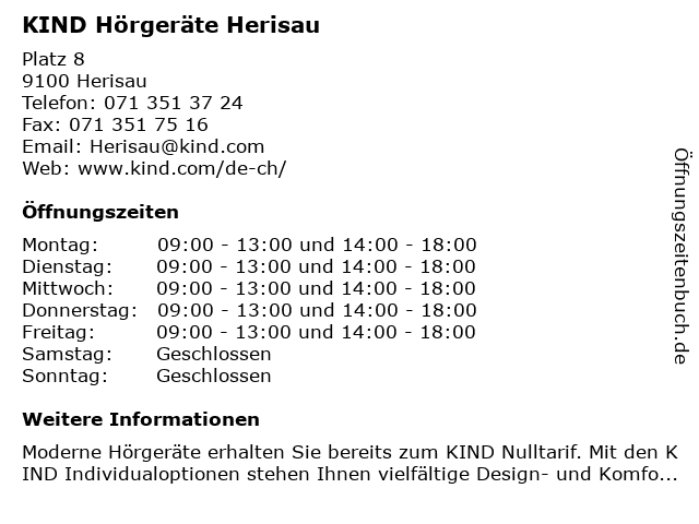 | Öffnungszeiten KIND Hörgeräte Herisau in Herisau anzeigen | |