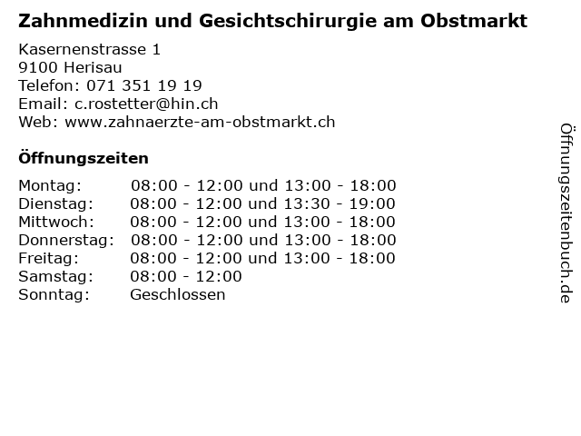 1 Zahnmedizin Wiesental - Dr. med. dent. P. Lenherr (Entfernung: 0,14 km) Bahnhofstrasse 6, 9100 Herisau 2 Praxis für Zahnmedizin, Implantologie, Kiefer- und Gesichtschirurgie - Dr. Dr. med. W. Hallermann, Dr.. U. Schneider, Dr. S. Schöber (Entfernung: 7,48 km) St. Leonhard-Strasse 78, 9000 St.Gallen 3 Zahnarzt St.Gallen - Praxis für Biologische Zahnmedizin (Entfernung: 8,08 km) Poststraße 23, 9000 St. Gallen 6 |
