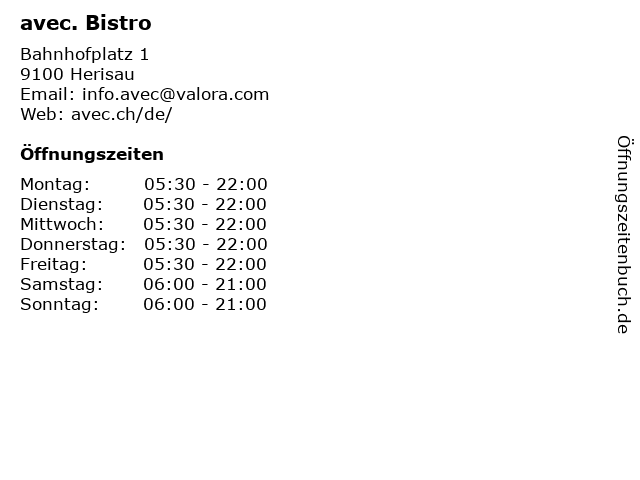 | Öffnungszeiten avec. Bistro in Herisau anzeigen | |