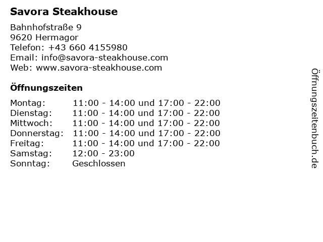 | Öffnungszeiten Savora Steakhouse in Hermagor anzeigen | |