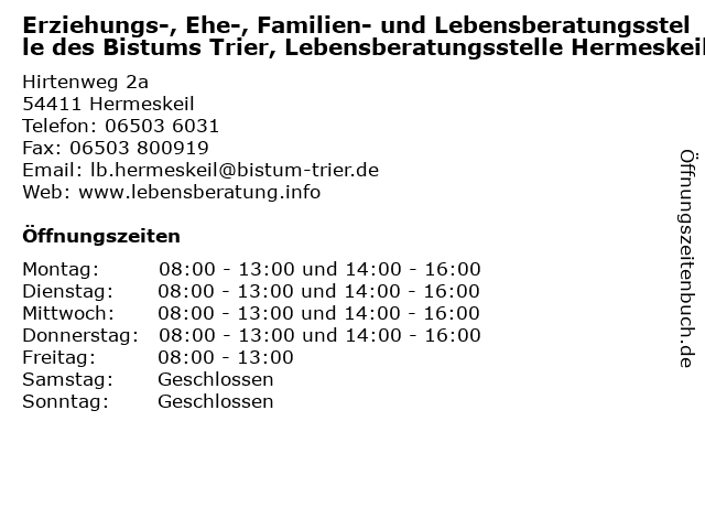 Branchen & Suchbegriffe zu Erziehungs-, Ehe-, Familien- und Lebensberatungsstelle des Bistums Trier, Lebensberatungsstelle Hermeskeil:beratungsstellen, bistums, des, ehe, eheberatungsstellen, erziehungs, erziehungsberatungsstellen, familien, lebensberatungsstelle, schwangerschaftsberatungsstellen, soziale |