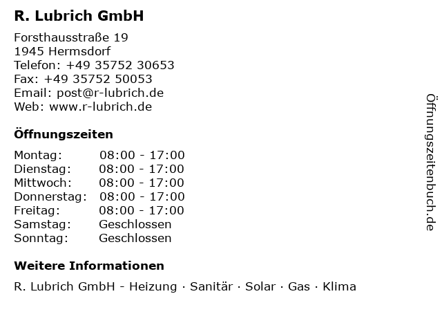 | Öffnungszeiten R. Lubrich GmbH in Hermsdorf anzeigen | |