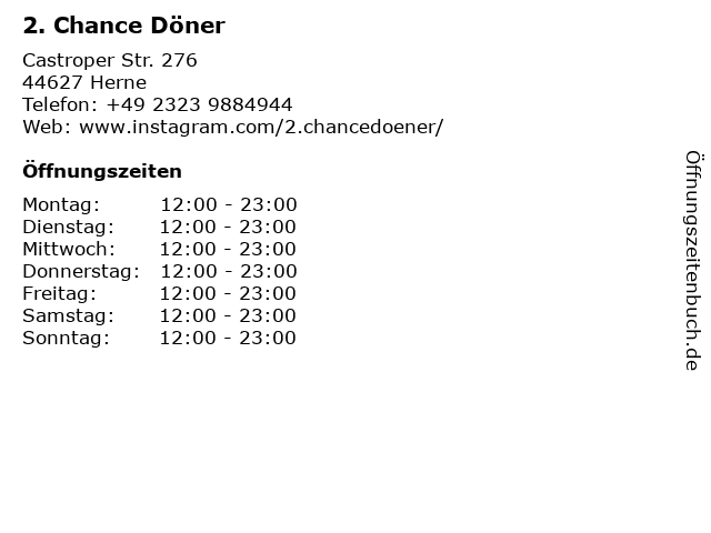 | Öffnungszeiten 2. Chance Döner in Herne anzeigen | |