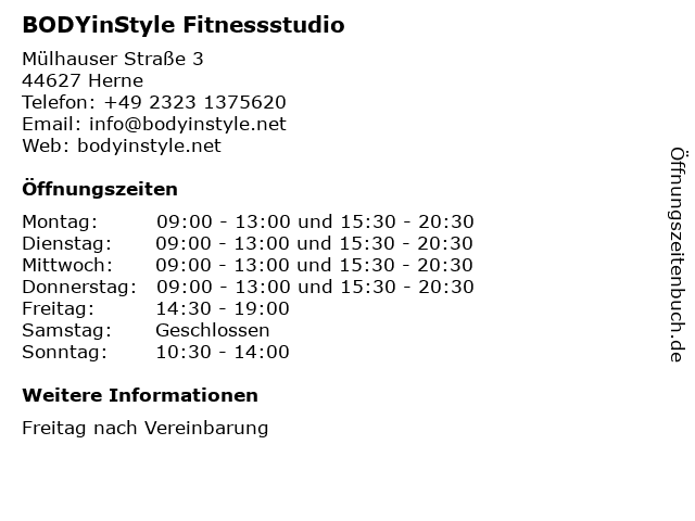 | Öffnungszeiten BODYinStyle Fitnessstudio in Herne anzeigen | |
