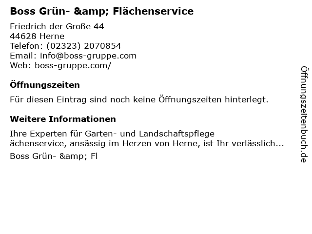 | Öffnungszeiten Boss Grün- & Flächenservice in Herne anzeigen | |