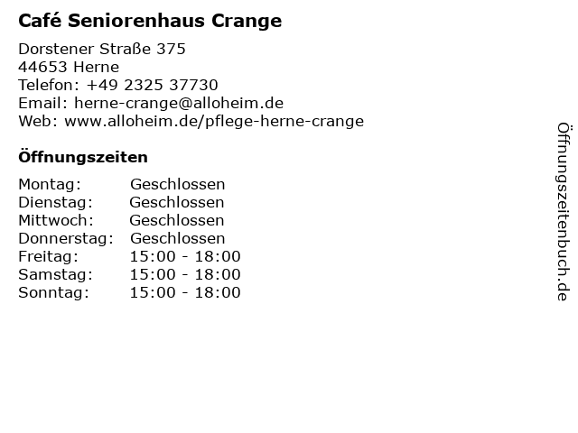 | Öffnungszeiten Café Seniorenhaus Crange in Herne anzeigen | |