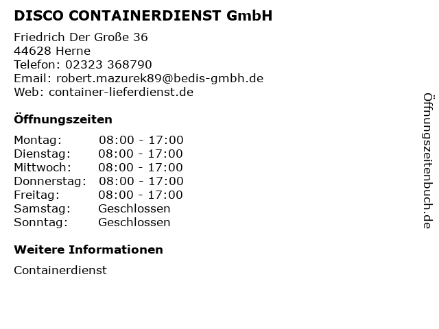 | Öffnungszeiten DISCO CONTAINERDIENST GmbH in Herne anzeigen | |