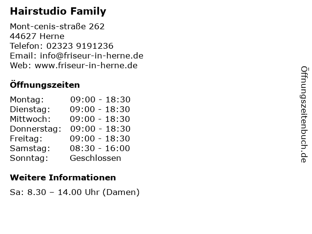 | Öffnungszeiten Hairstudio Family in Herne anzeigen | |