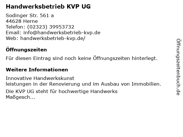 | Öffnungszeiten Handwerksbetrieb KVP UG in Herne anzeigen | |