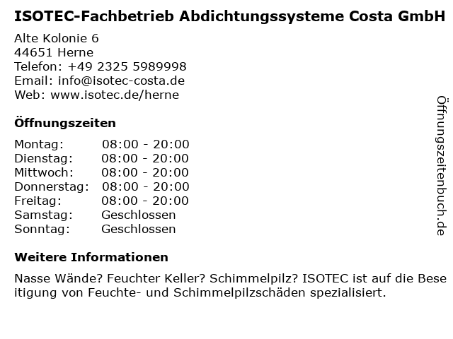 Branchen & Suchbegriffe zu ISOTEC-Fachbetrieb Abdichtungssysteme Costa GmbH:abdichtung, abdichtungssysteme, außenabdichtung, balkon, balkonsanierung, beseitigung feuchtigkeit, costa, drainage, fachbetrieb, feuchter keller, feuchtigkeit, horizontalsperre, innenabdichtung, isolierung, isotec, keller, kellerboden, nasse wände, sanierung, sanierung feuchtigkeitsschaden, schimmel, schimmel entfernen, schimmelentfernung, wandsanierung |
