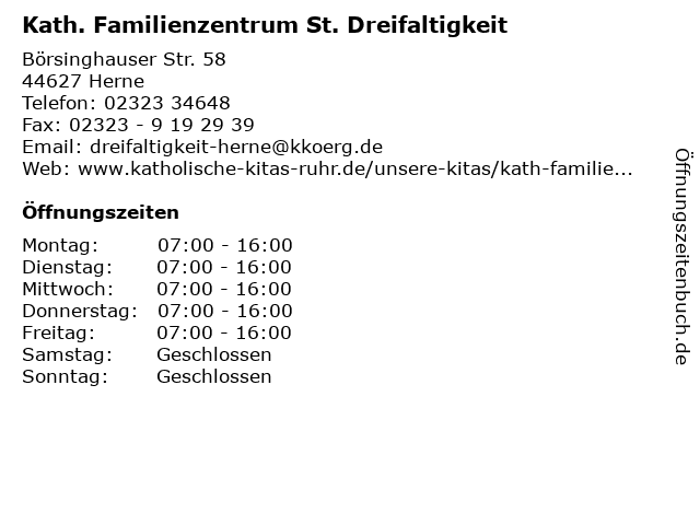 1 Pfarrbüro Kath. Kirchengemeinde St. Dreifaltigkeit (Entfernung: 0,04 km) Börsinghauser Str. 60, 44627 Herne 3 Kath. Kirchengemeinde St. Franziskus Xaverius Pfarrbüro Grohsmann Winfried Pfarrer (Entfernung: 3,61 km) Frohlinder Str. 52, 44577 Castrop-Rauxel 6 Pfarrbüro Kath. Kirchengemeinde St. Marien (Entfernung: 4,88 km) Bismarckstraße 72a, 44629 Herne-Baukau |