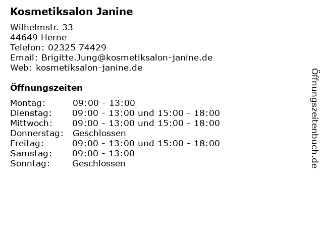 | Öffnungszeiten Kosmetiksalon Janine in Herne anzeigen | |