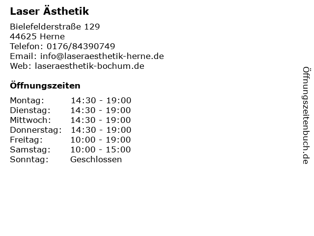 | Öffnungszeiten Laser Ästhetik in Herne anzeigen | |