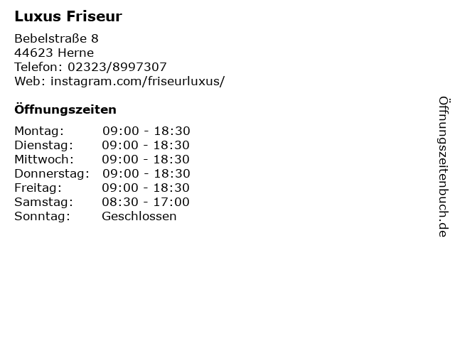| Öffnungszeiten Luxus Friseur in Herne anzeigen | |